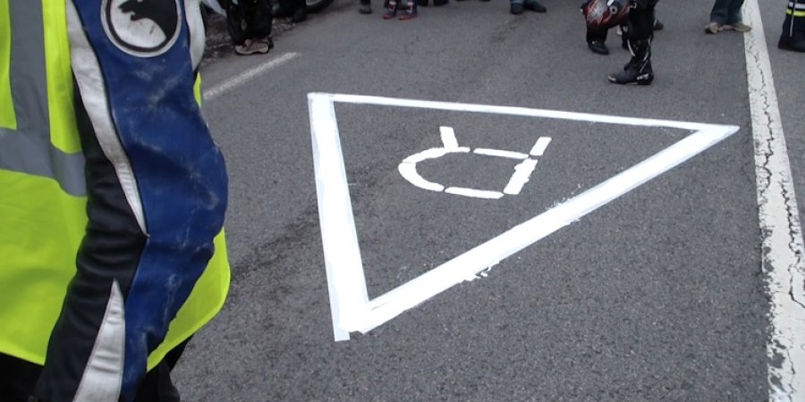 Hautes-Alpes: Le radar tronçon installé entre Aspres sur Buëch et Aspremont est maintenant signalé… au sol. La Fédération Française des Motards en Colère s’est réunis ce matin pour organiser une manifestation de désobéissance. Encadrés par la Gendarmerie, plus d’une cinquantaine de motards ont occupé la route pour marquer leur opposition au radar tronçon mis en activité depuis le 24 mars. « Il ne sert à rien. Sur une ligne droite sans intersections, nous voyons mal comment cette zone peut être classée comme accidentogène » explique Eric Boulanger, coordinateur de la FFMC 05. Le maire d’Aspremont, également opposé à l’implantation de ce radar, confirme ces propos. « De mémoire d’homme, il n’y a jamais eu d’accident sur cette voie. Alors que plus loin, c’est dangereux et les routes ne sont même pas éclairées. Cela coûterait trop cher » déclare le maire d’Aspremont. Aux grands maux, les grands remèdes. 5 motards encagoulés ont pris l’initiative de marquer ce radar tronçon à la peinture blanche. Maintenant, tout le monde est prévenu qu’il faut lever le pied . Écoutez les propos d’Eric Boulanger, coordinateur de la FFMC05: