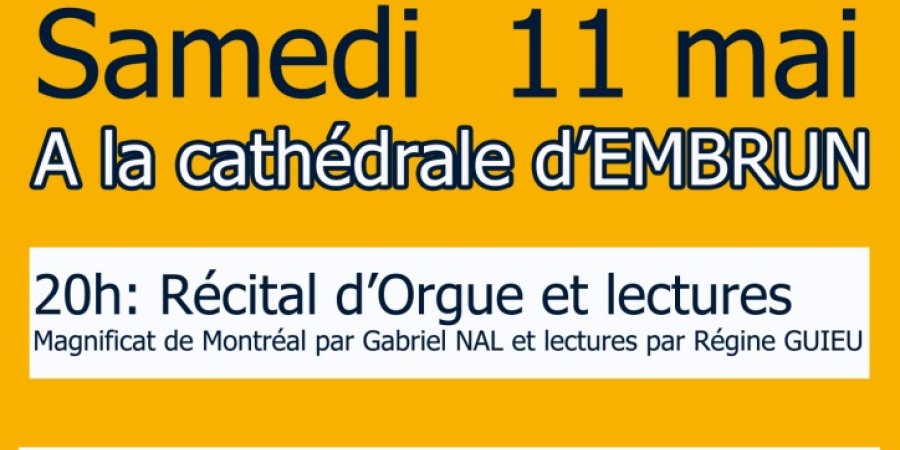 - 20h: Récital d'orgue et lectures -->Magnificat de Montréal par Gabriel NAL et lectures par Régine GUIEU.