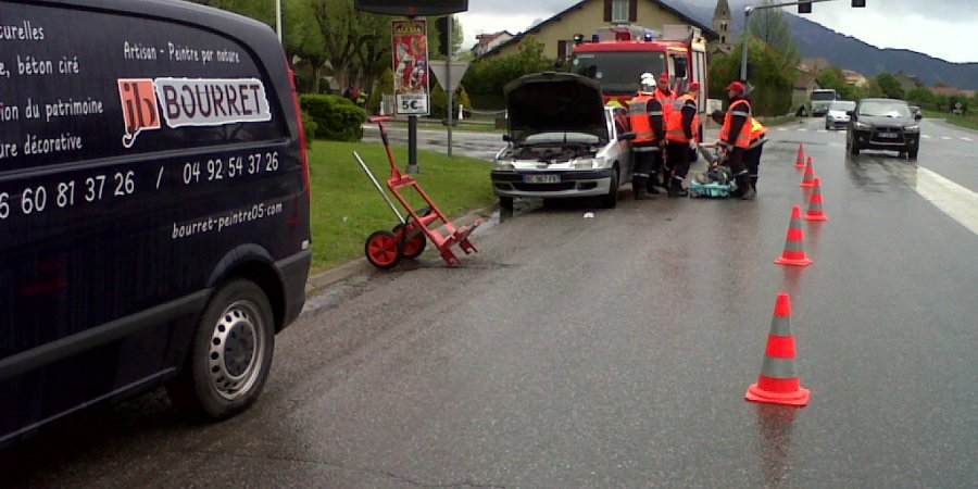 Hautes-Alpes : Deux voitures se sont percutées ce midi aux feux tricolores de la commune de Chorges. Une personne a été légèrement blessée et évacuée sur le centre hospitalier de Chorges. Le conducteur qui a tenté de passer à l'orange au feu et qui a été percuté par une autre voiture.