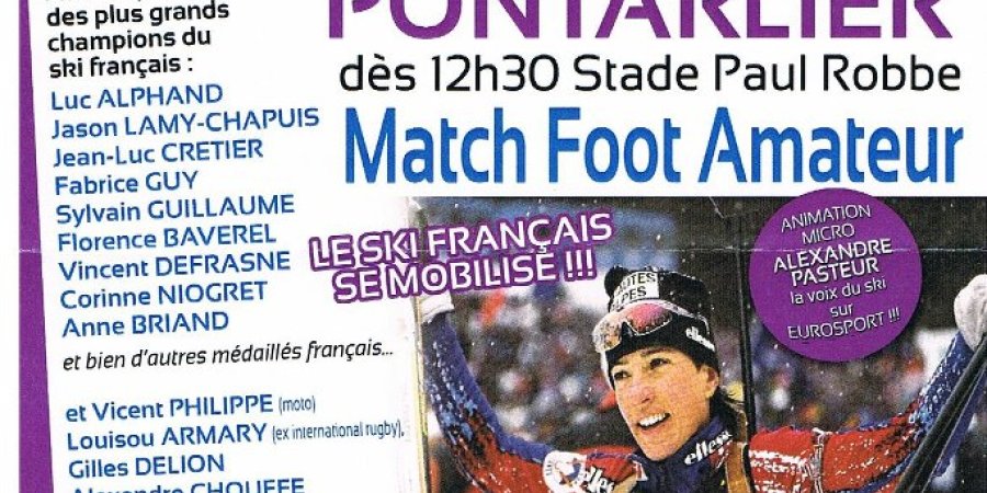 Le rassemblement débutera à 12h30 par un repas sous chapiteau. A partir de 13h30, avant le match de football, qui opposera une équipe constituée de grands champions à une formation composée de joueurs issus des équipes de rugby et de football de Pontarlier, le public pourra participer à une séance d’autographes. Sur place, il pourra rencontrer : Jason Lamy Chappuis, Florence Baverel, Vincent Defrasne, Vincent Philipe, Gilles Delion et le footballeur international Eric Carrière. Sans oublier la nouvelle génération : Celya Aymonier, Anouk faivre Picon, Aurore Jean et Samuel Guy.