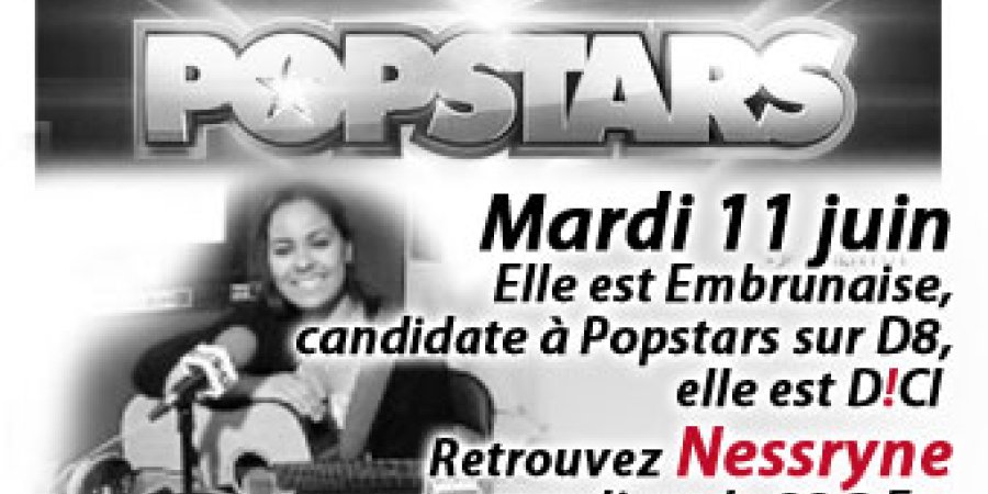 Hautes-Alpes: Titre: Nessryne, la jeune embrunaise de 17 ans a donc fait forte impression à l'émission Popstars diffusée sur D8. Après ses auditions à Marseille, elle rejoint maintenant Paris avec 40 autres finalistes.Vous la verrez donc à nouveau mardi prochain et ce soir à 20h50 en rediffusion sur D 17.