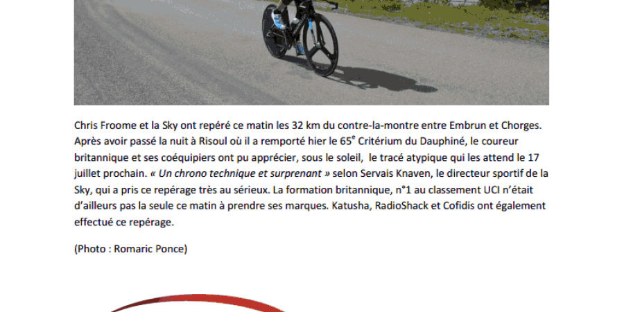 Hautes-Alpes: Chris Froome et la Sky ont repéré ce matin les 32 km du contre-la-montre entre Embrun et Chorges. Après avoir passé la nuit à Risoul où il a remporté hier le 65e Critérium du Dauphiné, le coureur britannique et ses coéquipiers ont pu apprécier, sous le soleil, le tracé atypique qui les attend le 17 juillet prochain. « Un chrono technique et surprenant » selon Servais Knaven, le directeur sportif de la Sky, qui a pris ce repérage très au sérieux. La formation britannique, n°1 au classement UCI n’était d’ailleurs pas la seule ce matin à prendre ses marques. Katusha, RadioShack et Cofidis ont également effectué ce repérage.