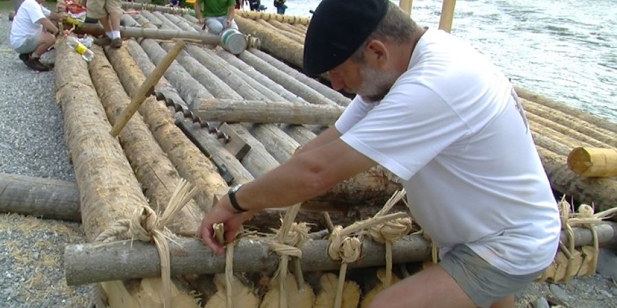 La plage de Saint Clément sur Durance se transforme en un véritable atelier à ciel ouvert de construction de radeaux. Ce travail de longue haleine basé sur les techniques ancestrales montre la complexité et le travail d’orfèvre de ces hommes. Les rondins de mélèzes et de sapins sont assemblés et liés entre eux par des branches de frênes, pour permettre à la fois souplesse et robustesse de l’embarcation.