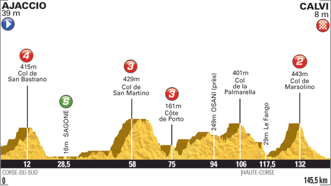 Aujourd’hui, l’étape Ajaccio – Calvi sera encore plus intéressante avec de nombreuses difficultés, la dernière étant le col de Marsolino, dont le sommet sera situé à 12 km de l’arrivée, avec 3,3 km d’ascension à 8,1 % de moyenne. Nous pourrions assister à l’arrivée d’un groupe encore plus réduit qu’hier avec les leaders de chacune des formations et, peut-être, avec un nouveau et troisième Maillot Jaune.