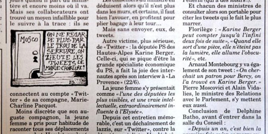 Hautes-Alpes : Le Buzz de Karine Berger sur Twitter continue... et même dans le Canard Enchaîné du 3 juillet. L'affaire : une interview de Karine Berger à La Provence il y a quelques semaines qui avait déclenché un flot inattendu de commentaires et de railleries sur Twitter au point de la placer en tête des consultations ! Les moqueries portaient sur des phrases de cet interview où elle paraissait se présenter comme très influente et où certaines réponses apparaissaient comme prétentieuses en tout cas pour certains qui en ont profité pour rivaliser d'inventivité sur le sujet.
