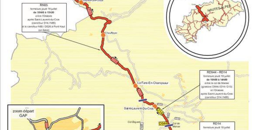 Le déroulement du contre la montre individuel entre Embrun et Chorges nécessite de fermer la RN 94 à proximité de Chorges de 4h00 à 22h00.