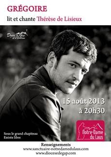 Hautes-Alpes Le chanteur Grégoire à Notre-Dame-du-Laus... Il a répondu présent à l'invitation de Monseigneur Di Falco qui célébrera la messe à 10 h 30. Grégoire contera puis chantera des textes de Sainte-Thérèse-de-Lisieux sous chapiteau (entrée libre) . Le chanteur Grégoire a en effet crée un album dédié à Sainte-Thérèse sorti au mois d'avril dernier... et sur lequel il fait chanter des grandes voix de la chanson française, telles Natasha Saint-Pier et Angunn.