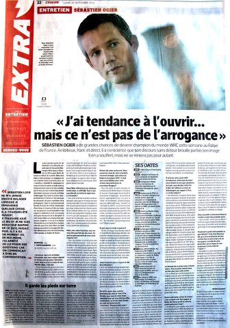 Hautes-Alpes: Une page entière consacrée à Séb' Ogier dans l'Equipe ce matin. A 3 jours du Rallye de France qui s'annonce historique, le pilote champsaurin revient sur son parcours et ses relations avec les autres pilotes du plateau... Interview complète donc à retrouver dans l'Equipe. Un rallye que vous pourrez suivre sur le 90.2 et dici.fr avec notre envoyé spécial sur place en Alsace, Adrien Citeau... et des émissions spéciales jeudi après-midi... à l'occasion du sacre peut-être de Sébastien Ogier lors de la Power Stage du Rallye d'Alsace.