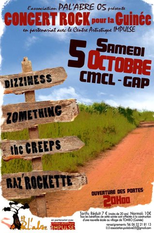Hautes-Alpes: Un concert rock au CMCL samedi soir à Gap. Les association Pal'abre 05 et Impulse vous proposent un concert Rock au CMCL avec les groupes Dizziness, Zomething, The Creeps et les Raz'Rockette !!! Tous les bénéfices participeront à la construction d'une école dans le village de Tombo en Guinée. "4 supers groupes et une bonne cause, ça fait 5 bonnes raisons de réserver votre soirée !" selon les organisateurs !