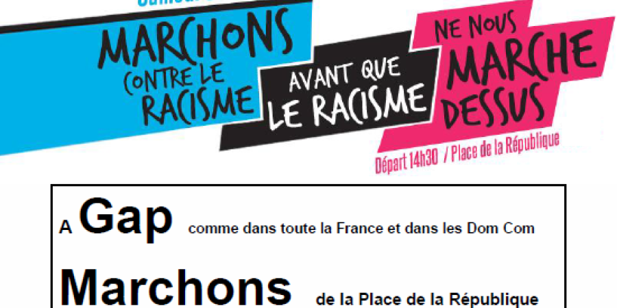 Hautes-Alpes: Une marche contre le racisme organisée samedi à Gap. Un collectif de citoyens soutenus par la CFDT – CGT – CIMADE – FSU – Le Mouvement de la Paix – Solidarité Maroc – Solidaires FASE – M’PEP - Parti Occitan, est à l'origine de ce rassemblement. Ce collectif souhaite défendre " les valeurs de l’humanité, toutes celles et ceux qui veulent opposer l’égalité et la fraternité aux visages hideux du racisme" et invite la population à participer à une marche samedi à Gap. Le départ du rassemblement est fixé à 14 h 30, place de la République. D'autres manifestations sont prévues au niveau national, même jour, même heure.