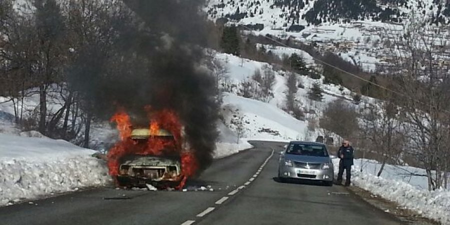 Hautes-Alpes : Une voiture a pris feu sur la route de Réallon ce matin peu avant 11h. Pas de blessés mais une belle frayeur pour le propriétaire de ce véhicule et un joli bouchon occasionné le temps de dégagé la route pour accéder à la station.