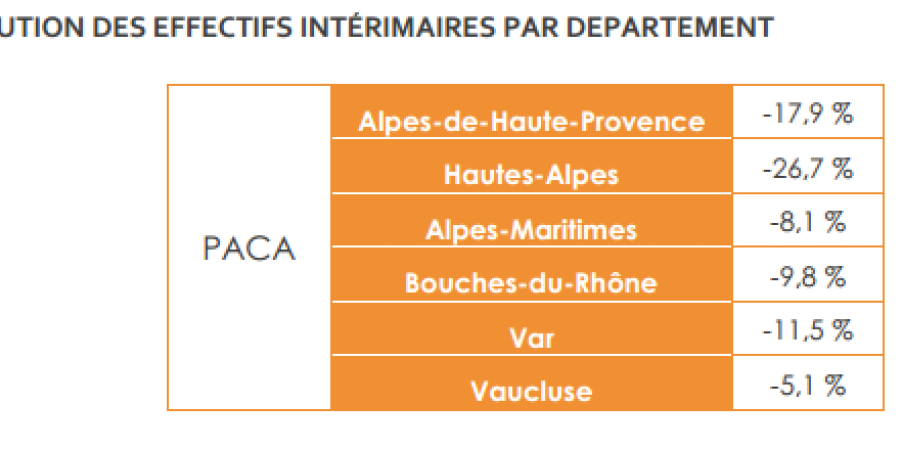 Hautes-Alpes : Les effectifs intérimaires sont en baisse en France et le département des Hautes-Alpes ne coupe pas à la tendance. L'ensemble des secteurs est touché mais c'est le BTP qui paie la plus grosse note entre janvier 2013 et janvier 2014. Les Hautes-Alpes est le département de la région PACA qui enregistre la plus forte baisse des emplois intérimaires -26,7% . C'est -17,9% pour les Alpes de Haute Provence quant la moyenne régionale est de -9,6%. Ce sont en tout cas les chiffres publiés par Prism'Emploi.