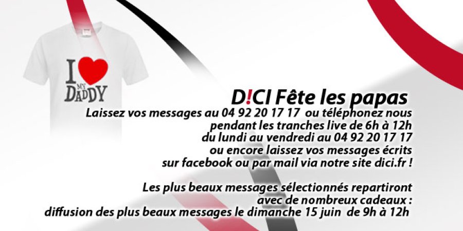 Hautes-Alpes: D!CI fête les papas ! Adressez un message à votre père au 04 92 20 17 17, durant nos tranches live de 6h à 12h, sur Facebook ou par mail sur notre site. Les plus belles déclarations seront diffusées le dimanche 15 juin de 9h à 12h, sur D!CI Radio et D!CI TV et vous rapporteront de nombreux cadeaux.