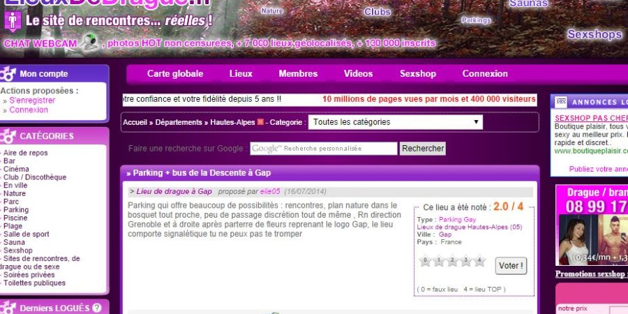 Et enfin toujours à Gap mais là, on tombe dans le glauque : « Des toilettes sans séparation situées derrière le parc, en face du tribunal de Gap. De nombreuses rencontres avant que je déménage à Marseille »