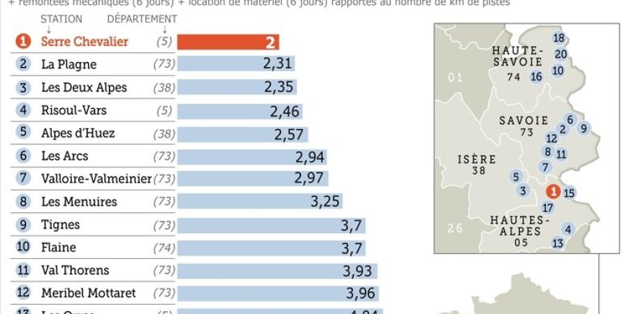 Hautes-Alpes : Serre-Chevalier, station la moins chère de France ! au kilomètre. Selon une étude publiée ce jeudi par Locasun pour Le Figaro, le domaine skiable de Serre-Chevalier revient à 2 euros le kilomètres, soit la station la moins chère de France. Il faut dire que Serre-Chevalier a aussi, l'un des plus grands domaine skiable dans l'Hexagone. Le prix au kilomètre y est, mécaniquement, moins cher, pour des tarifs, y compris en pleine saison. Les Hautes-Alpes qui sont bien représentées dans ce classement, puisque le domaine de La Forêt Blanche, Risoul/Vars, figure en 4e position avec un prix au kilomètre skiable de 2,46 euros. Autre très belle performance pour le 05, c'est la station de Puy-Saint-Vincent qui la réalise, avec le prix du séjour le moins cher de France sur une semaine en pleine saison à 363,72 euros par personne. Toujours selon cette étude, le prix du séjour à Serre-Chevalier, aux alentours des 499 euros, se situe dans la moyenne nationale des grandes stations de ski. À noter enfin, les prix au kilomètres pour la station des Orres : 4,04 euros (13e position), Montgenèvre : 4,44 euros (15e position) et Puy-Saint-Vincent (4,85 euros). Et sur le 3e critère étudié par cette enquête, c'est la qualité de ski sur les pistes. Et là, c'est encore une station haut-alpine qui sort du lot : celle de Vars. La station de la Forêt Blanche est en effet celle qui a la plus faible densité de skieur sur ses pistes avec moins de 100 skieurs au kilomètres. À Serre Chevalier, les pistes sont dans la moyenne avec une densité de 148 skieurs pour un kilomètre de piste. Ainsi, en combinant les critères de coût et de densité, c'est la station de Vars qui devient «la plus agréable» selon Locasun, devant Les Deux-Alpes et Serre Chevalier.