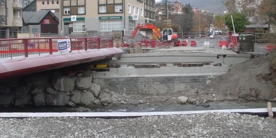 Pas de grue ni d’engins spectaculaire pour cette dernière phase de la construction du nouveau pont sur la Durance, dans le centre-ville de Briançon, qui remplace l'ancien vieux de 124 ans et qui n'était plus apte à la circulation. Le nouveau pont avait été livré en octobre en deux parties.Simplement quatre hommes pour déplacer les 220 tonnes du nouveau pont et mettre celui-ci dans l’axe de la route avant de le raccorder à la voirie et de l’ouvrir au public.