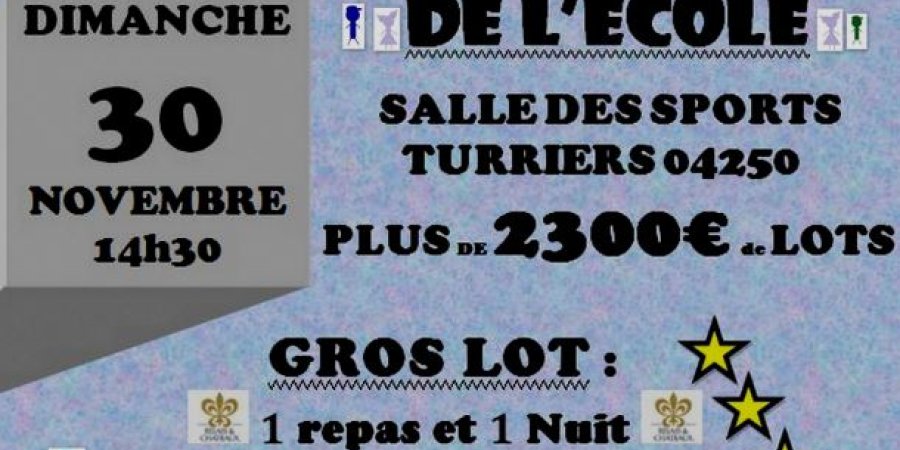 L'hiver approche. Et la saison des lotos également. Ce samedi à Ribiers de 20h30 à 23h30. Dimanche à Eyguians à partir de 14h. Dimanche encore à Chauffayer à partir de 14h30. Et enfin toujours ce dimanche à la Salle des Fêtes de Turriers à partir de 14h. Notez pour Turriers que ce loto permettra de financer le voyage de fin d'années des enfants de la commune.