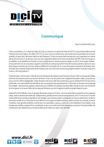 C'est une évidence pour tous les observateurs et ces derniers jours nous l'ont confirmé, il y a dans les Alpes du Sud, un avant et un après l'arrivée de D!CI TV, la première télévision de l'histoire de notre région. En effet, D!CI TV, et nous vous en remercions, est entrée dans le quotidien de la quasi totalité, on peut dire, des Haut-Alpins et des Ubayens. C'est le cas aussi des touristes qui nous regardent en masse dès qu'ils viennent ici, et de tous ceux qui nous regardent ailleurs en France via les Boxs de SFR, Free et Orange, et le satellite, via la plateforme Fransat ou tout simplement en streaming et en replay sur dici.fr et les appli mobiles.