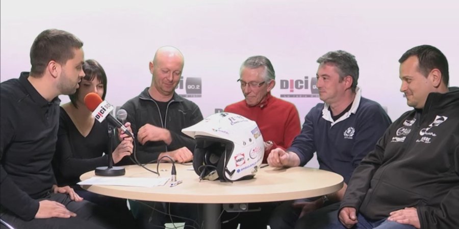 En plateau, au micro d'Adrien Citeau : Jean-Jacques Marcellin, consultant Rallye à D!CI Media, Jean-Noël Mondet et Laura Thomas, Christophe Arnaud et Stéphane Brunier.