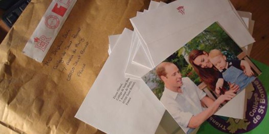Depuis trois ans, leur professeure d’anglais, Delphine Davin, se sert des actualités de la famille royale britannique pour apprendre la langue de Shakespeare à ses élèves, de la 6ème à la 3ème. Et elle leur propose d’écrire à Kate et William. « Nous avons écrit pour leur mariage, à la naissance du prince George et à Noël. À chaque fois, nous avons reçu une réponse»,explique Delphine Davin. Aussi, à chaque élève qui leur a envoyé ses vœux - chacun a fait lui-même sa carte, travaillant ainsi également les arts plastiques - ; le petit-fils de la reine Elizabeth II, du Royaume-Uni de Grande-Bretagne et d’Irlande du nord et son épouse, ont adressé une carte, illustrée de la photo où ils posent avec Baby George pour son premier anniversaire. «Ils attendaient ça avec impatience ! Le prochain courrier sera pour la naissance du deuxième enfant.