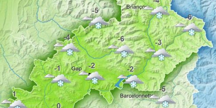Les nuages viennent se concentrer à l'est d'Embrun et de Barcelonnette en donnant des chutes de neige très faibles mais plus significatives sur la frontière italienne et notamment l'est du Queyras. Plus à l'ouest, le soleil doit composer avec des voiles élevés, épais en matinée, et de la grisaille parfois tenace dans les basses vallées du Champsaur, du Valgaudemar et du Dévoluy. Températures froides pour la saison, au mieux faiblement positives en vallées l'après-midi. Vent faible à modéré de nord à est en vallées avec de la Lombarde près de l'Italie. En montagne vers 3000 m, vent de secteur est vers 40/70 km/h jusqu'à 80/90 km/h en Ubaye.