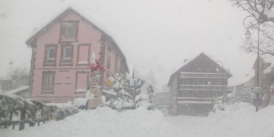 Après une brève accalmie, la neige a repris depuis ce vendredi midi : Il en est déjà tombé 1,60 m en haut des pistes d'Abriès, et 90 cm en bas, dans la vallée ! Un tél épisode neigeux s'était déjà produit dans le Queyras en 2008 : 2,50m de neige était tombé dans le Haut-Guil.