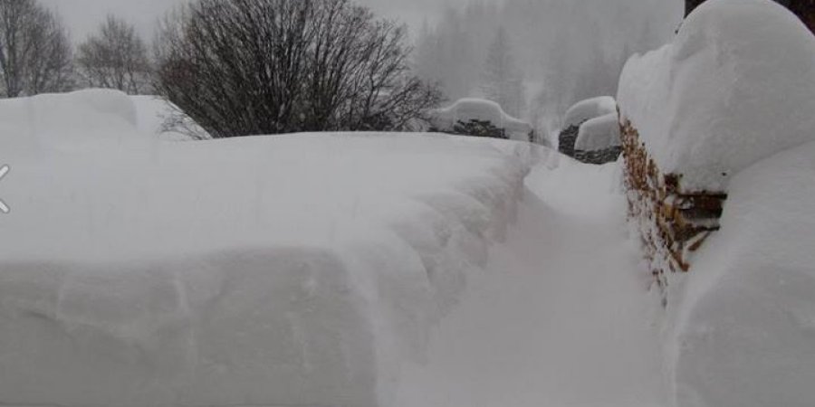 Après une brève accalmie, la neige a repris depuis ce vendredi midi : il en est déjà tombé 1,60 m en haut des pistes d'Abriès, et 90 cm en bas, dans la vallée ! Un tél épisode neigeux s'était déjà produit dans le Queyras en 2008 : 2,50 m de neige était tombé dans le Haut-Guil.