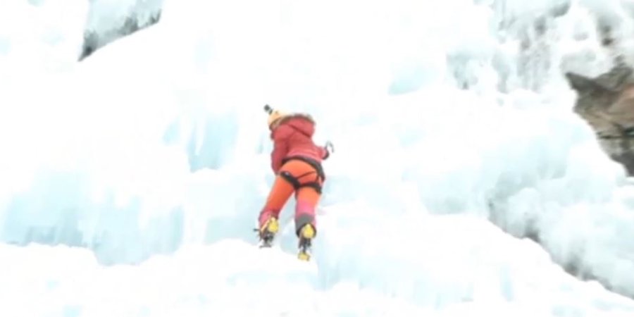 A Pelvoux, la chroniqueuse Caroline Thurbide teste la cascade de glace, pour l'émission LeGrand8.