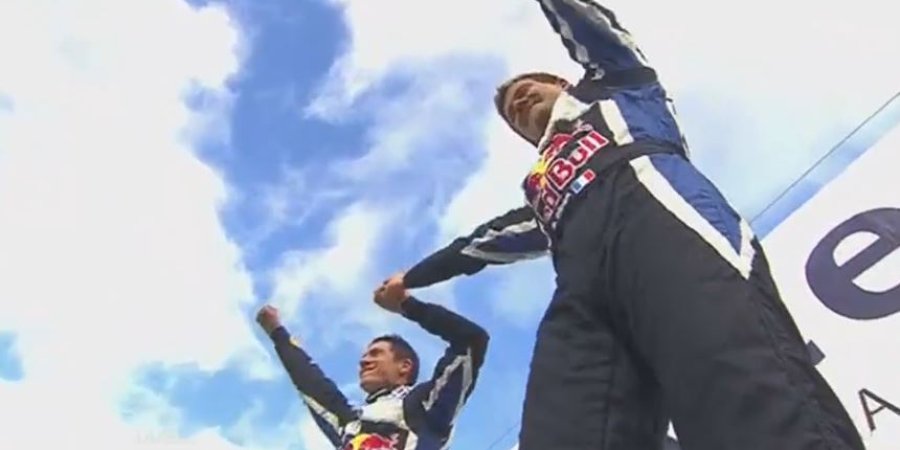 Interview à l'arrivée grâce à L'Equipe 21, Séb Ogier apprend des journalistes présents la sortie de route de Mikkelsen, et par conséquent sa victoire :