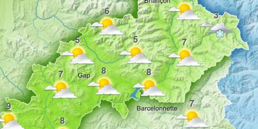 Laragnais et 5/7 degrés à 2000 m. Vent en vallées faible à modéré d'est le matin puis sous forme de brises montantes