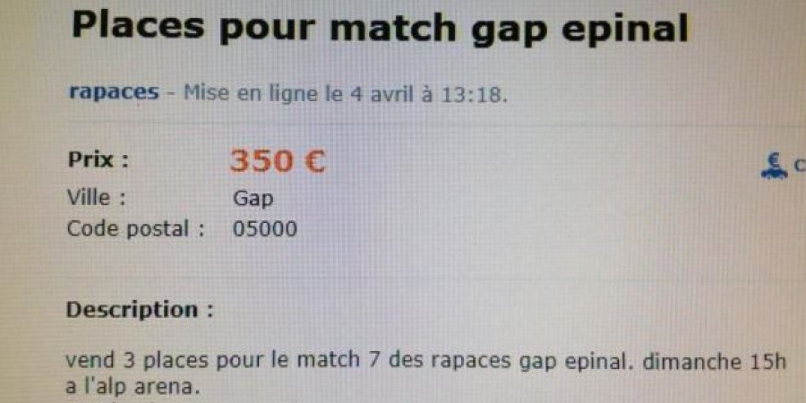 La finale de Ligue Magnus qui se jouera à l'Alp'Arena attire énormément de monde. Et parmi ces personnes, certaines ont décidé de profiter de l'occasion et n'hésitent pas à revendre les places qu'elles ont achetées à prix fort : 350 € les trois places, par exemple, sur "Le Bon Coin". Le club des Rapaces de Gap a décidé de déposé une plainte. Il a déposé une main courante dans ce sens.