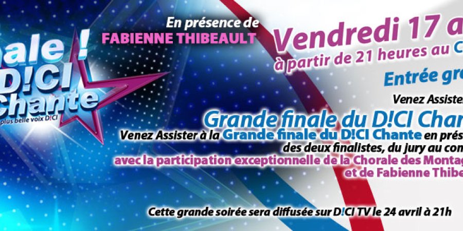 C'est ce vendredi, en live et en public au club 30 à Chorges (entrée gratuite) que se déroulera à partir de 21 heures la grande finale du D!CI Chante, qui devra départager Sofy de La Saulce, et Marie-Ange, de Fouillouse, pour élire la plus belle voix D!CI . Cette soirée, dont la marraine est Fabienne Thibeault, se déroulera en présence de la toute nouvelle Miss Alpes du Sud, Léa Gomez, et elle nous réserve de nombreuses surprises, avec en particulier la prestation de la Chorale des Montagnes, mais aussi de Stéphan Orcière, de Sonia Lombardo, de Kevin Oss, de plusieurs duos ...et bien sûr les chansons interprétées en live par Sofy et Marie-Ange qui, depuis lundi, se préparent activement.