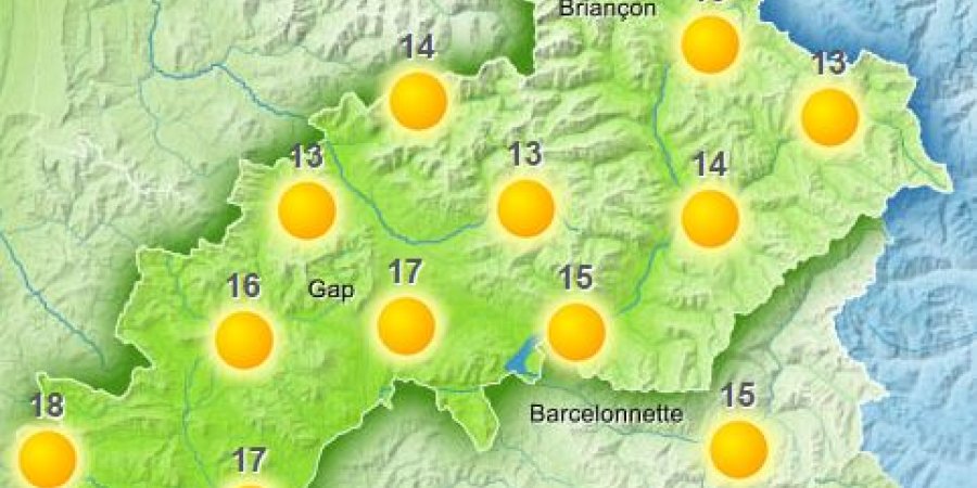 Les températures maximales avoisinent les 20/24 deg en vallées du nord au sud et 12 deg vers 2000 m. Isotherme 0 deg en hausse vers 2700 m le matin puis 3000 m l'après-midi.