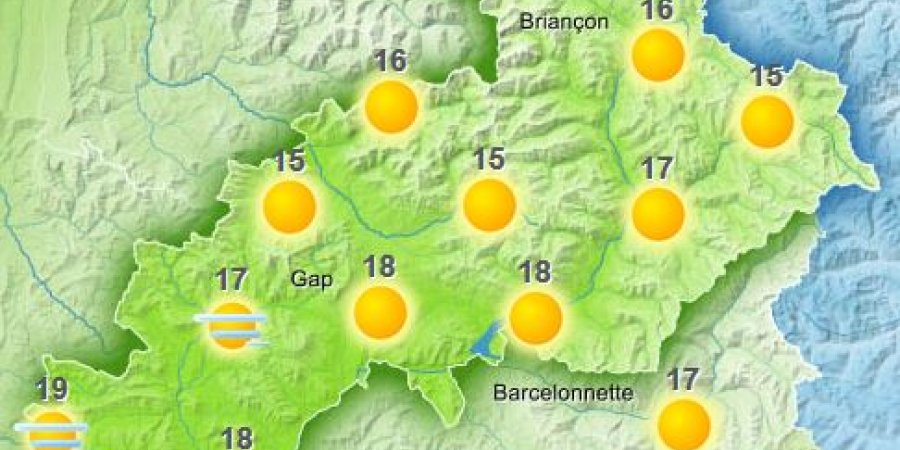 La journée débute sous un ciel menaçant, et de rares averses sont possibles sur le haut relief (limite pluie-neige vers 2000/2200 m). Amélioration en cours d'après-midi. Les températures accusent une baisse marquée avec tous ces nuages, elles ne dépassent pas 14 à 18 deg en vallées, localement 20/22 deg à Gap ou Laragne.