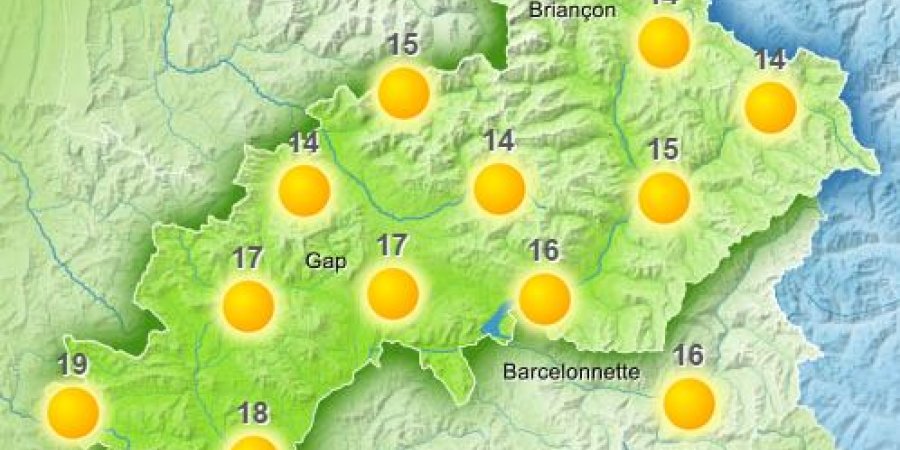 La matinée est ensoleillée, puis de fins nuages d'altitude traversent les Hautes Alpes et l'Ubaye l'après-midi. Le ciel est couvert la nuit suivante. Les températures maximales affichent 18 à 24 degrés, 16/18 vers 2000 m. Isotherme zéro degré fluctuant entre 2700 et 3300 m. Vent généralement faible, les brises dominent ; elles sont souvent modérées l'après-midi. A 3000 m vent du nord 10/30 km/h le matin puis ouest 20/40 km/h l'après-midi.