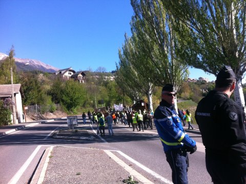 Hautes-Alpes : Ils sont au moins une soixantaine déjà présents à Embrun. Des CRS sont prêts à contrer tout débordement des opposants aux lignes THT. Le dossier est en effet présenté ce vendredi par RTE/EDF au complexe de la Robeyère. Les manifestants , près de 300, dont l'association Avenir Haute-Durance se sont rassemblés dés 9h puis ont défilé jusqu'à l'entrée du chateau dont les CRS bloquent l'entrée. Parmi les manifestants des élus dont les maires et Conseillers départementaux de la Batie-Neuve et de Puy Sagnières