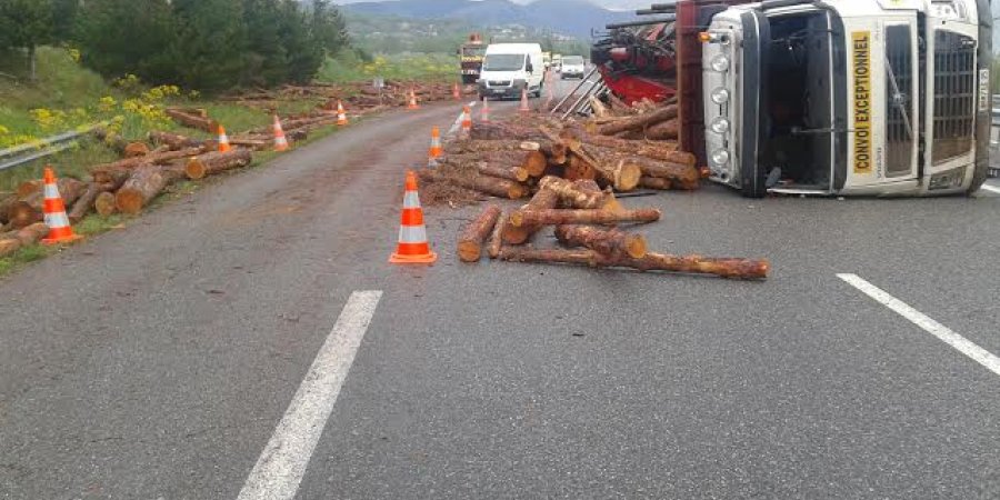 Hautes-Alpes : Un spectaculaire accident s'est produit ce matin sur l'autoroute A 51 à hauteur de la commune du Poët. Un camion grue avec une remorque s'est renversé sur la chaussée. Le chauffeur se serait assoupi au volant selon les premières informations recueillies par les gendarmes sur place. Tout le chargement d'environ 50 tonnes de grumes 2 mètres environ, s'est répandu sur une centaine de mètres.