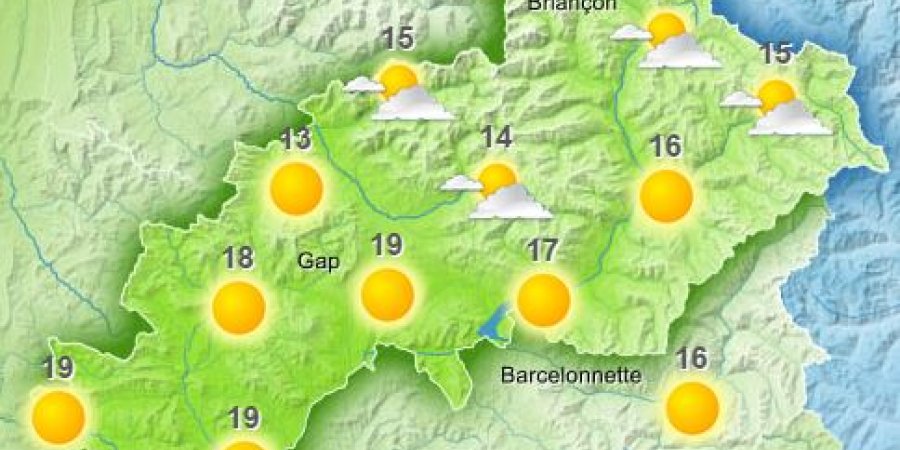 Les nuages du début de journée, porteurs parfois de quelques gouttes surtout près de l'Isère et de la Savoie, se font grignoter par le soleil au fil des heures de la matinée. Il peut enfin briller généreusement l'après-midi, au milieu de quelques cumulus stériles. Les températures restent douces pour un début mai avec un point culminant proche de 19/25 degrés de Briançon vers Laragne et 12/14 degrés à 2000 mètres. L'isotherme 0 degré oscille entre 2700 et 3000 mètres.