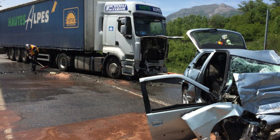 Hautes-Alpes : Un homme de 32 ans a trouvé la mort, ce lundi midi dans une terrible collision à la sortie Est de Gap à hauteur du garage Audi (entre Gap et Pont-Sarrazin). Le conducteur de la voiture a été tué sur le coup. Le conducteur du camion, très choqué, a lui été évacué sur l'hôpital de Gap. Selon les premiers témoignages, ce serait la voiture qui se serait déportée étonnamment sur la gauche de la chaussée. Une déviation par Romette a été mise en place.