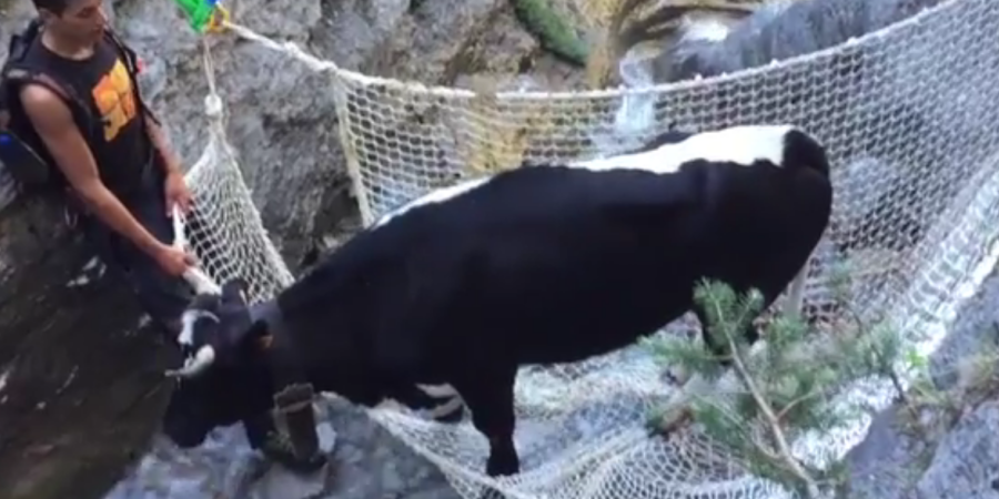 Hautes-Alpes : cmardi, une vache a été sortie d'un torrent entre Château-Ville-Vieille et Aiguille, dans le Queyras. Le secours a été effectué en hélicoptère. Reportage Michel Toupet.