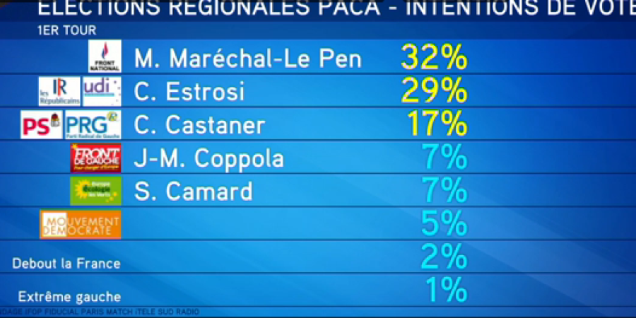 Régionales PACA : selon un sondage Ifop-Fiducial réalisé pour iTELE, Paris Match et Sud Radio, la candidate Front national Marion Maréchal-Le Pen est en tête des intentions de vote, à 32 %. Arrivent ensuite le candidat LR (ex-UMP)-UDI Christian Estrosi avec 29 % des suffrages, puis le socialiste Christophe Castaner, qui obtiendrait 17 % des voix. Au second tour, en cas de triangulaire, les trois candidats seraient dans un mouchoir de poche, avec une légère avance pour le candidat de l'union de la droite. Écoutez la réaction de Christophe Castaner, la tête de liste régionale pour le Parti socialiste. Christophe Castaner estime que ce sondage est "positif" dans le sens où la gauche part divisée. Il fait le parallèle avec l'élection de 2010, où Michel Vauzelle (président PS sortant) était largement distancé dans les sondages, mais l'avait finalement emporté. Interview.