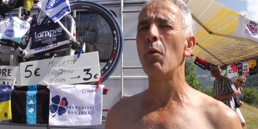 Joswabir est neerlandais, posté au début de la cote de PraLoup il n'est pas la que pour voir le Tour. Collectionneur d'objets lié au vélo, il troc et vend au bord de la route pour compléter sa collection de plus de 3000 bidons d'eau différents d'équipe professionnelle de vélo. Rencontre :