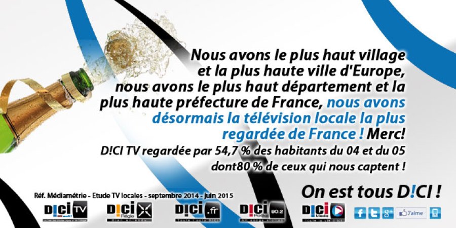 D!CI TV, D!CI RADIO ET www.likeradio.fr, C'EST AUSSI L'OFFRE DE COMMUNICATION LA PLUS PUISSANTE DES ALPES DU SUD : N’HÉSITEZ PAS À CONTACTER D!CI RÉGIE AU 04 92 52 07 31. VOUS POUVEZ ÊTRE VU ET ENTENDU ICI ET DANS LA FRANCE ENTIÈRE À DES TARIFS TRÈS RAISONNABLES.