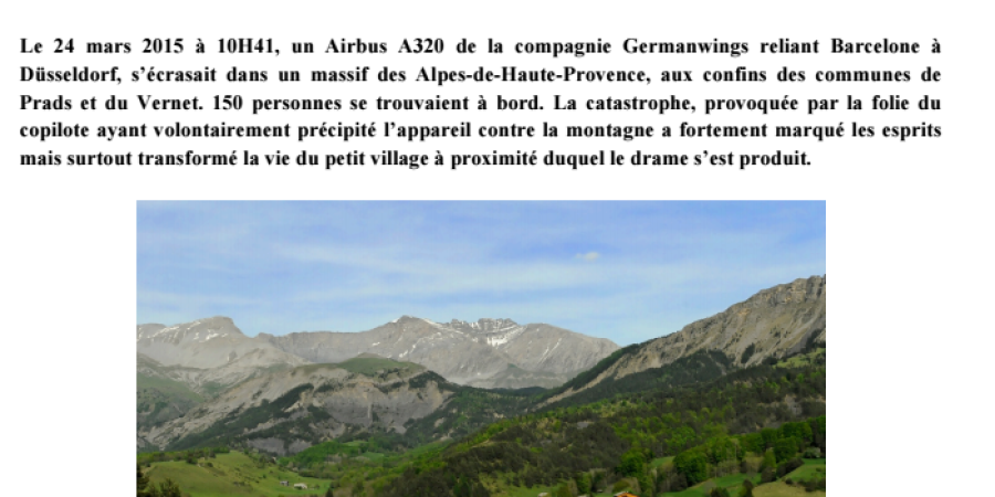 Alpes de Haute-Provence : Un livre sur le crash de l'A 320. Le 24 mars 2015 à 10 h41, un Airbus A320 de la compagnie Germanwings reliant Barcelone à Düsseldorf s’écrasait dans un massif des Alpes-de-Haute-Provence, aux confins des communes de Prads et du Vernet. Cent cinquante personnes se trouvaient à bord. La catastrophe, provoquée par la folie du copilote ayant volontairement précipité l’appareil contre la montagne, a fortement marqué les esprits, mais surtout transformé la vie du petit village à proximité duquel le drame s’est produit. Écrit dans les semaines qui ont suivi le drame, "Retour au Vernet" est le témoignage d’un des tous premiers journalistes présents sur la zone du crash. C’est aussi et surtout le récit du traumatisme vécu par un petit village alpin soudainement confronté à un épouvantable drame, puis jeté sous les feux de l’actualité. Déferlement médiatique, accueil des familles des victimes, puis verrouillage des accès aux montagnes du Vernet et de Prads sur décision préfectorale ; dans un premier temps, Nicolas Balique raconte les heures qui ont directement suivi le crash. De retour au Vernet quelques semaines plus tard, il relève les traces qu’a laissées le drame sur les habitants, dont beaucoup sont ses amis. Ce récit sur une journée d’horreur et ses suites est à la fois un reportage journalistique, une réflexion sur l’intrusion des médias dans une petite communauté de Haute-Provence et un hommage aux victimes du drame.