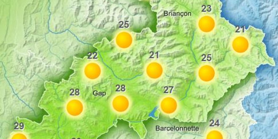 Le soleil est généreux. Les cumulus de l'après-midi ne font qu'un peu d'ombre aux randonneurs. Ils pourraient tout au plus lâcher quelques gouttes sur les plus hauts sommets en fin d'après-midi. Les températures sont tout juste de saison, avec au maximum 24 à 27 degrés en vallées, 28 à 30 degrés dans le Buëch et le Gapençais, et 15 à 17 degrés à 2000 m. En vallées, le vent, toujours faible 10/20 km/h, s'oriente au sud-ouest. A 3000 m, le vent d'ouest est faible le matin, 10/20 km/h. De secteur sud-ouest, il se renforce l'après-midi, 20/30 km/h.