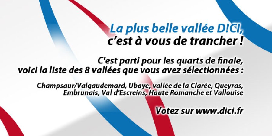 En liste, la vallée de l'Ubaye qui obtient 20% de vos votes, suivi du Champsaur Valgaudemard avec 19%, arrive ensuite la Vallée de la Clarée avec 17%, puis le Queyras avec 12%. L'Embrunais Serre-Ponçon obtient 9% ex aequo avec le Val d'Escreins Vars, et enfin la Vallouise obtient 7% et enfin la Haute Romanche La Grave ferme ce tableau avec 6% de vos votes. . Attention, ce vendredi, il ne restera que 4 vallées à concourir. Votez et faites voter sur www.likeradio.fr