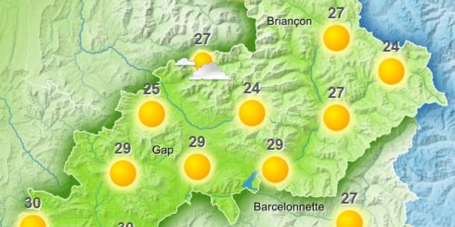 Quelques nuages peuvent accompagner le soleil au lever du jour sur le nord et l'est du département, avant de s'effacer.Des cumulus bourgeonnent l'après-midi. Ils apportent de l'ombre et laisser planer un faible risque d'averse isolée sur la fin de journée, plutôt près de l'Italie et dans les Écrins. Températures stationnaires et chaudes. Vent de secteur sud en vallées renforcé par des brises l'après-midi.