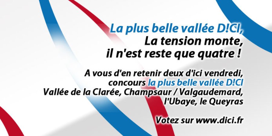 Un point sur le concours de "la plus belle vallée". Le concours continue et il faut voter pour que votre vallée préférée remporte le concours. La vallée de l'Ubaye est en tête de ce classement avec 29% des votes, suivie de la vallée Champsaur Valgaudemard qui obtient 28%. Vient ensuite la vallée de la Clarée avec 24% de vos votes, la vallée du Queyras ferme ce tableau avec 18% des votes. Votez et faîtes voter sur www.likeradio.fr.*