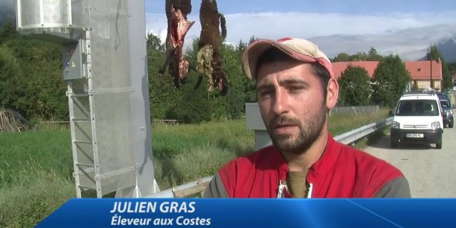 Hautes-Alpes : Une véritable opération coup de poing ce matin des Jeunes Agriculteurs à Brutinel. Ils ont pendu, sur la N85, à un panneau d'information du Conseil Départemental, deux carcasses de brebis, tuées dans une nouvelle attaque de troupeau survenue à Corps. La gendarmerie s'est rendue sur place, ainsi que des agents de la DDT (Direction départementale des territoires). 3 agriculteurs étaient présents. "On souhaite rentre à l'État ce qui appartient à l'État" précisent les Jeunes Agriculteurs:*