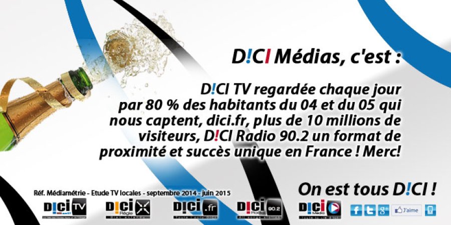 D!CI TV, D!CI RADIO ET www.likeradio.fr, C'EST AUSSI L'OFFRE DE COMMUNICATION LA PLUS PUISSANTE DES ALPES DU SUD : N’HÉSITEZ PAS À CONTACTER D!CI RÉGIE AU 04 92 52 07 31. VOUS POUVEZ ÊTRE VU ET ENTENDU ICI ET DANS LA FRANCE ENTIÈRE À DES TARIFS TRÈS RAISONNABLES.